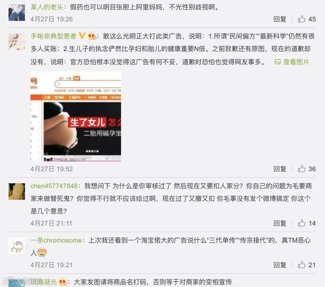 值得注意的是,此次碱孕宝广告已非首次犯错,淘宝网在去年接到网友投诉后,曾把有性别选择的商品和广告内容都下架,要求商家修改文案后才可重新上架。但今年,它们又卷土重来了。