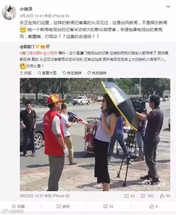 15日凌晨,厦门遭遇“莫兰蒂”台风袭击。随后厦门上下都投入到灾后重建。不过出人意料的是,今日@厦门往事微博转载爆料称,厦门电视台女记者采访灾后重建现场的时候,打着伞带着墨镜,站姿神似走秀,与被采访对象志愿者形成鲜明对比,此举大为不妥。