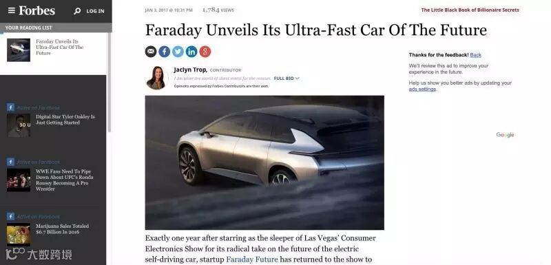 其中,认为这家企业是在对标特斯拉的西方媒体不在少数:CNN标题Secretive Tesla competitor unveils concept supercar、卫报标题Faraday Future takes on Tesla at CES with FF 91, the electric car that can learn,TechcrunchFaraday Future与特斯拉进行比较,有意思的是,谈论这款车的中国企业背景和贾跃亭其人的笔墨很少。