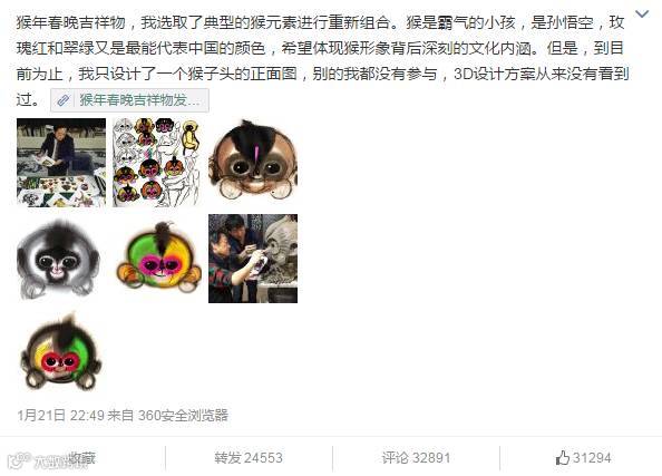 韩美林于22时发表《猴年春晚吉祥物发布,韩美林细说创作经过》,并在微博推送,表示“只设计了一个猴子头的正面图,别的我都没有参与,3D设计方案从来没有看到过。”