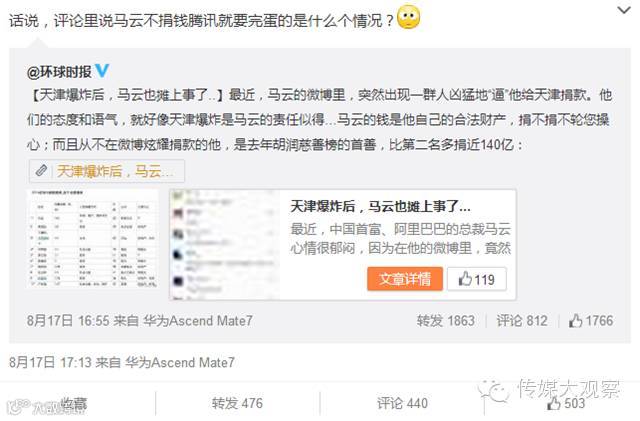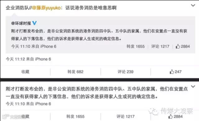 观察君注意到,在此次天津爆炸事故中,@环球时报 微博 多次引起网友围观,微博下面许多网友给肾6小编、美腿7小编表白,称“今天小编两米八”“要给小编生猴子”。