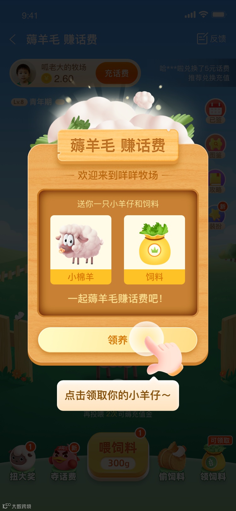 ”。用户只需要通过手淘充值中心进入活动页面,就能参加这次活动,领养属于自己的小羊。领养小羊后,通过完成任务的方式搜集饲料,喂养小羊,待小羊长出羊毛,即可薅羊毛,赚取掉落的充值金来抵扣话费。