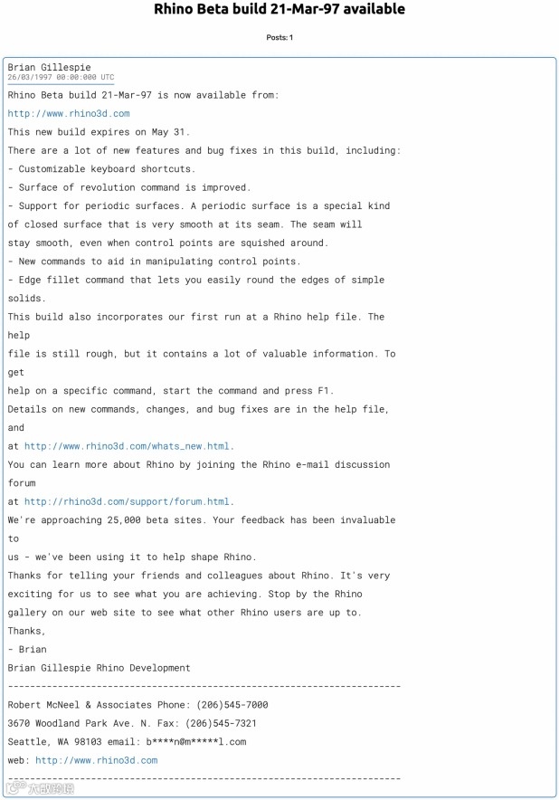 图5 Brian Gillespie 在 Rhino Usenet 论坛上宣布最新 Rhino 测试版发布,1997 年:截图。