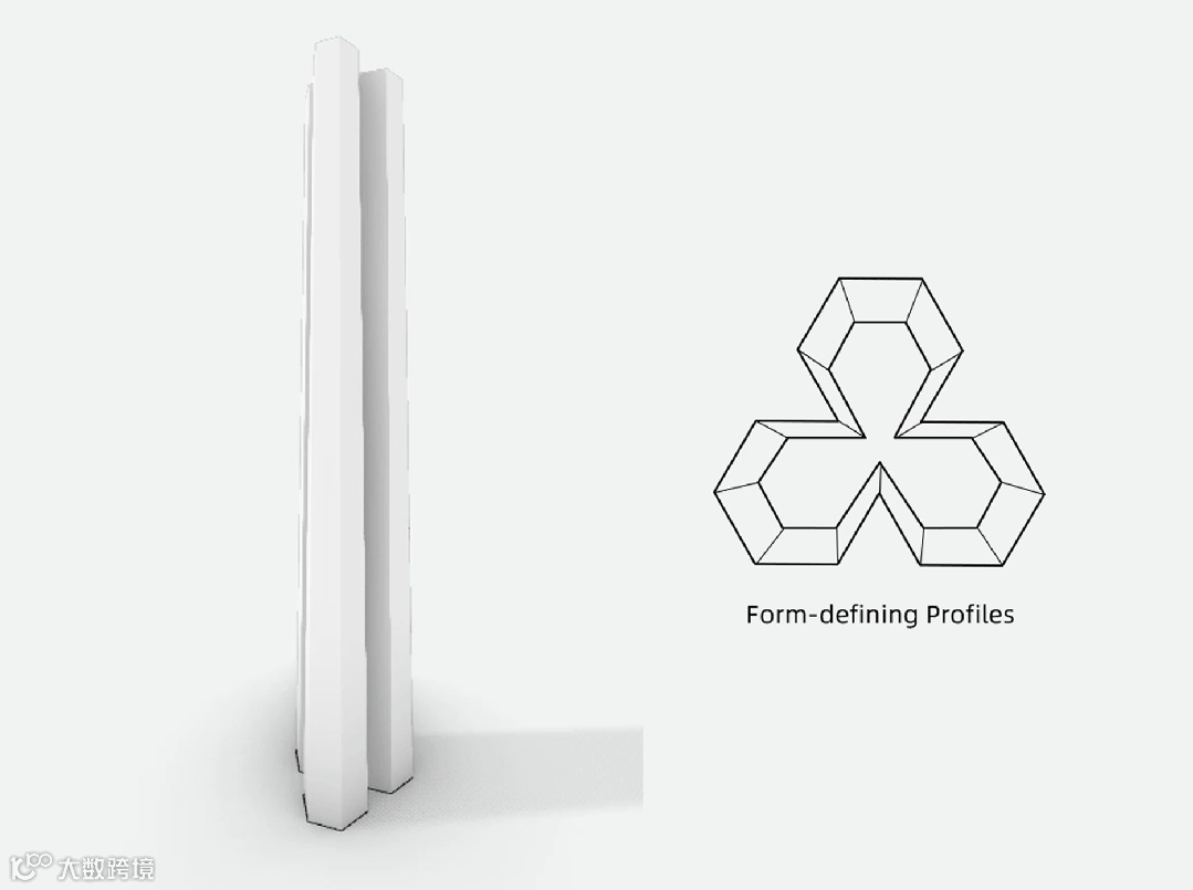形体演化的关键概念是通过对建筑高度、旋转、缩放等进行参数控制,沿着连接边缘曲线放样顶部和底部轮廓来定义生成动态的体块形状。提供了各种面的构成模式来塑造不同的塔楼形式,包括直线模式、曲线模式、圆形模式和三角形模式。