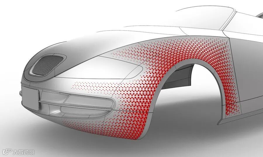 在产品的表面的设计需求有时候并不是纹理均匀的分布,而是需要配合一些设计特征,例如汽车表面的一些特征线和棱线,因此参数化的纹理必须有相应的可控性调整以拟合那些特征线。并且通常这个过程是在一个有多块面拼接的多重曲面上进行控制。