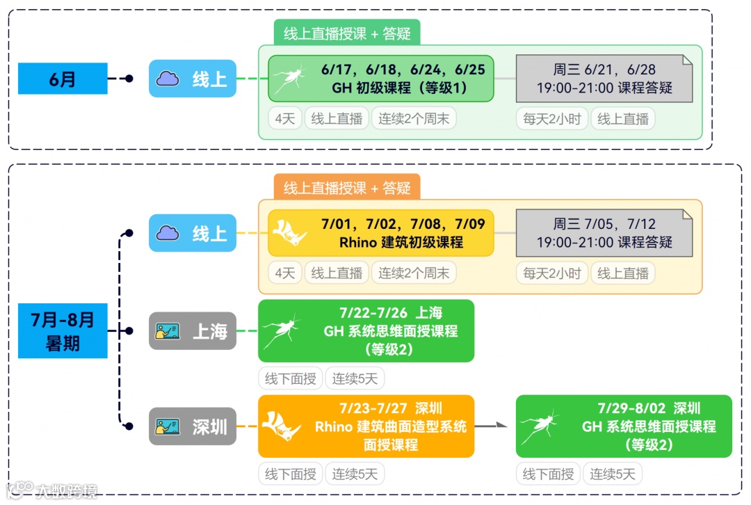 本阶段的课程并不教授 Grasshooper的参数化具体用法及分析思路等知识点。而是直接以目前行业中具有代表性的案例切入,介绍当前设计行业中对一些热点及难点设计技术问题的参数化解决方法及流程。