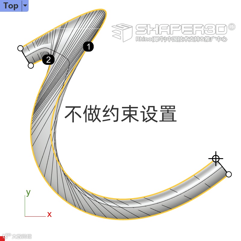 ▲ Rhino 6 中开启「节点」捕捉,在 放样工具 预览阶段将闭合点位置移动到同一侧的节点位置,生成的曲面结构会比曲线复杂很多