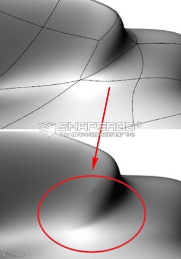 ▲三边网格在圆滑后,这处的表面会出现一些扭曲变形