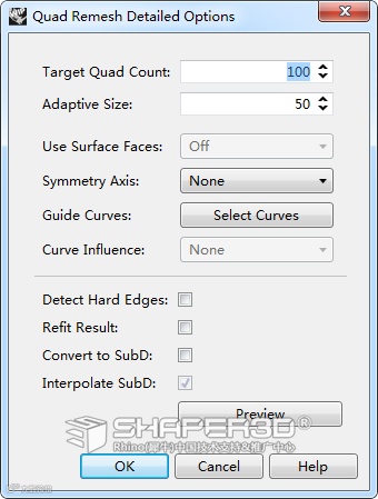 运行QuadRemesh 指令,选取模型后会弹出以下这个选项面板:
