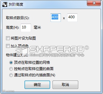 运行 Rhino 中的 Heightfield 指令,选取这张灰度图片,拖动鼠标在工作视窗中确定好大小,取样点400X400,生成网格。