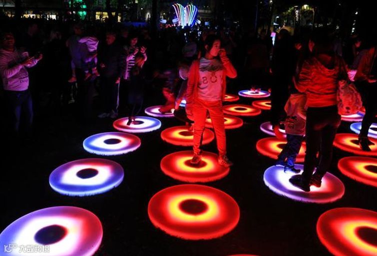 广场内布置着踩踏装置矩阵,当装置被踩下后会变换色彩,并发出欢快的声音反馈。游人在地板上来回穿行,享受音乐和光影的乐趣。