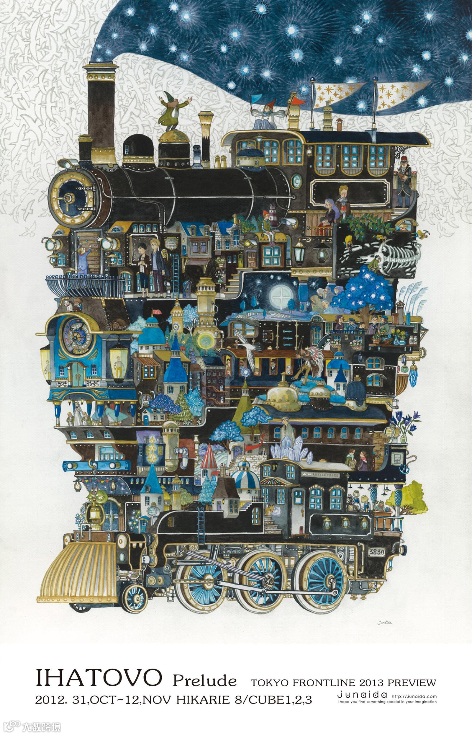 各种老式的蒸汽火车、堆叠的房子、书本和各种飞禽走兽在他的作品中时常出现,似乎他一直在历险寻找着他自己心中的理想国...手绘的水彩质感透着质朴的纹理,梦幻般童话的场景带给我们无限遐想...
