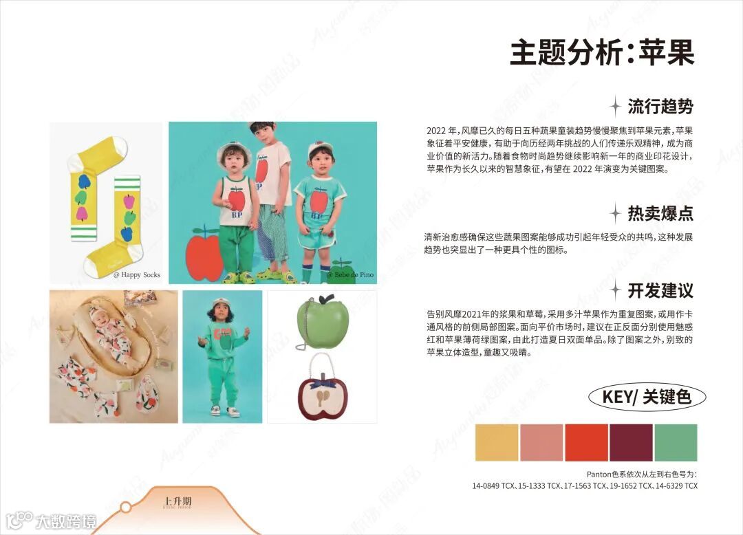 2022年,随着“食尚”趋势继续影响新一年的商业印花设计,苹果作为长久以来的智慧象征,有望在2022年演变为关键图案。告别风靡2021年的浆果和草莓,采用多汁苹果作为重复图案,清新治愈感能够引起年轻受众的共鸣。