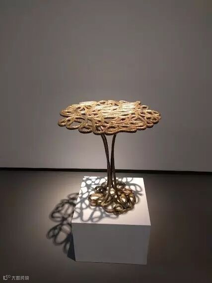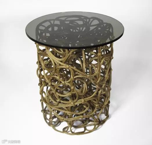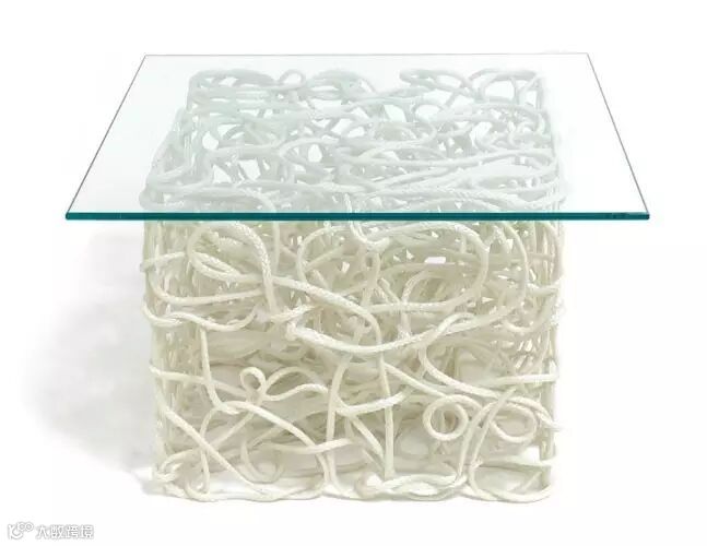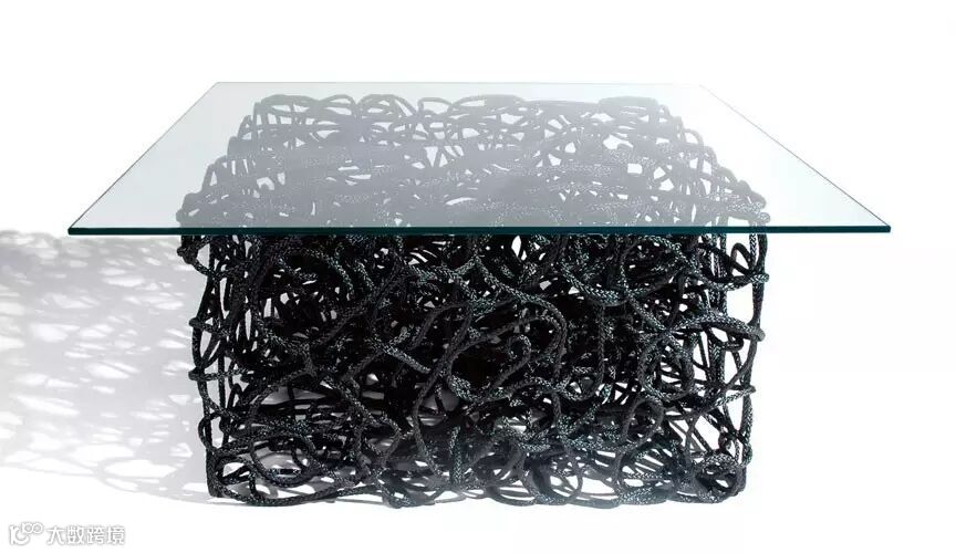 在荷兰语中的Knoop是“结”意思。设计师Josh迷恋控制"混乱",Knoop桌子系列就是他的作品,设计采用了树脂处理绳打结,数百英尺的绳子被扭曲,打结,弯曲成一个复杂的结构,放置在一个完美的立方体中,用简单的玻璃作为桌面。