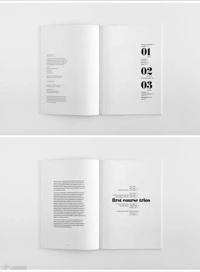 极简主义堪称功能性冠军。一个干净、清晰、整洁的设计令视觉导航通畅无阻,所需信息一览无余,James Kape 设计的这款版面就是个很好的例子。极简设计及清晰的字体分级信息都令目录页面简单易读,发挥了强大的功能性。