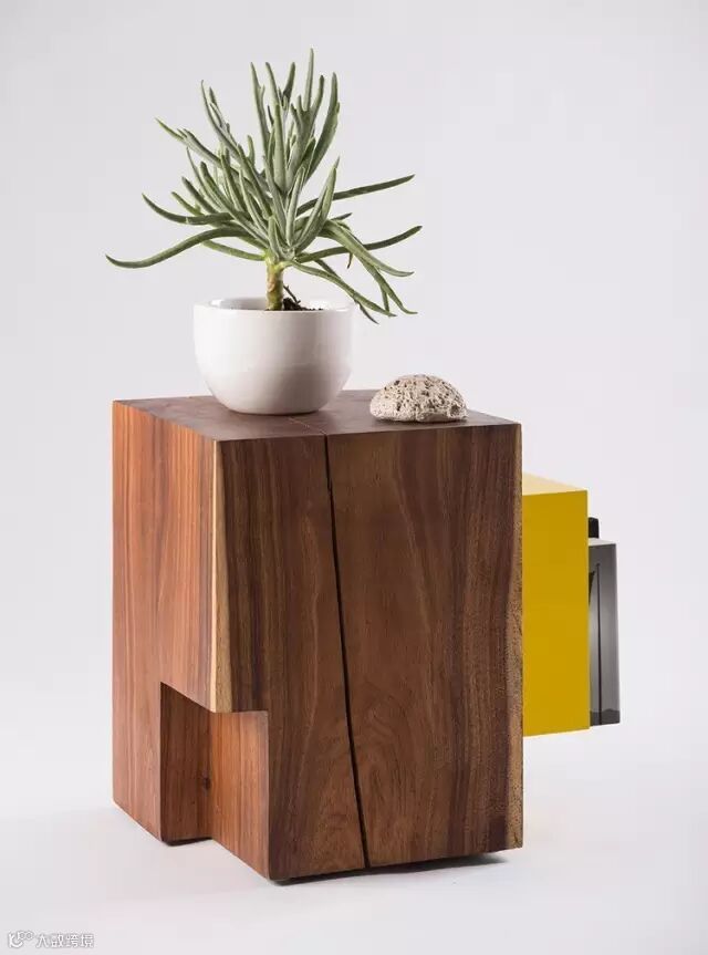 两种材料的组合也十分有趣,选择一块独特的硬木,镶嵌一块彩色钢板,随着灯光的变化,形成有趣的影子效果。它们可以作凳子、床头柜等。