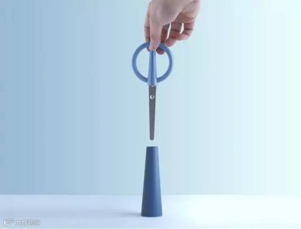 基本形式上采用的是传统剪刀的设计,同时加入了一个锥形基底,用来保持剪刀的站立,为了达到平衡,设计师把剪刀把手设计成了圆形,看上去更和谐稳定。