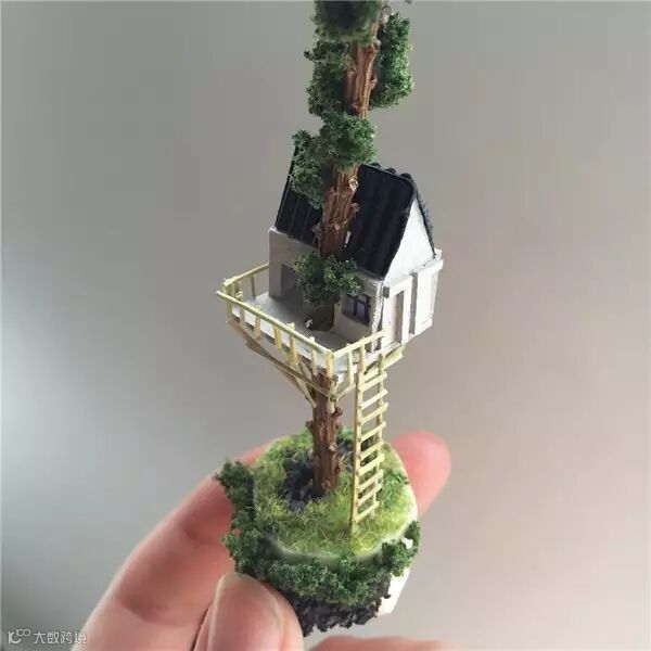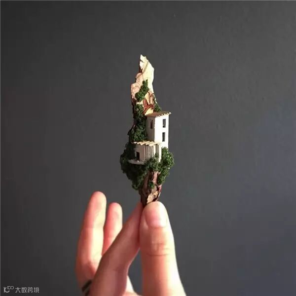 这些微缩的建筑物由卡纸、树皮、苔藓等材料制成,有着独特的结构形态,好像科幻作品和梦中那些离奇的房子。每一个模型都制作得非常精致,有着自身的土壤、植被等小环境,你甚至可以看到爬梯、电线杆等细小的构筑物,自成一个小世界。