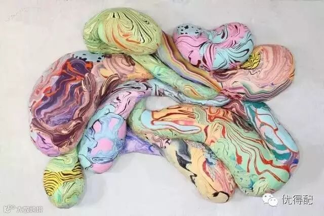 将塑料融化与彩色黏土混合搭配在一起。 将树脂浇注在木材和织物表面,然后切割下来显露出富有层次感的截面。 彩色螺旋纸筒是在车床上做成。