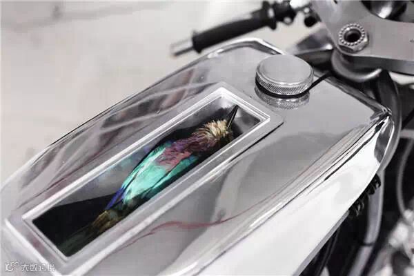 最诡异的是,在摩托车的油缸小小的装饰品——一只彩色的鸟的标本。Sebastian Errazuriz 一直对鸟类标本感兴趣,不知道是为何...