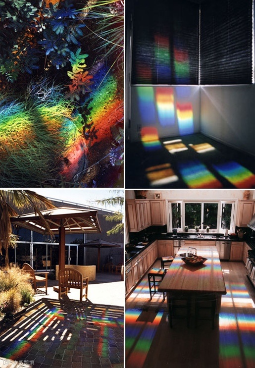 美国艺术家Peter Erskine创作了30年的激光切割棱镜艺术作品,将太阳光转化为彩虹投射在现代和历史遗迹上,留下艺术与建筑的混合体。