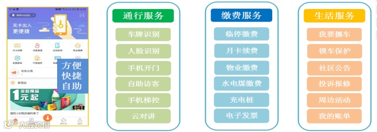 整合社区通行的车行、人行服务,做到统一服务入口与同一系统平台管理运营,为业主提供便捷自助的社区生活服务场景入口(微信公众号/APP),实现应用接口标准化开放,做到一个入口N项服务集成的用户感知输出;