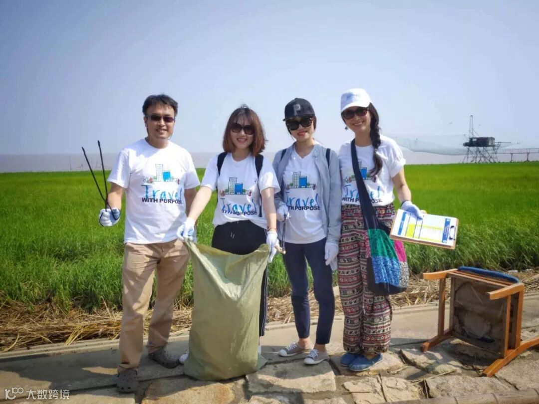 在捡垃圾过程中“找乐子”的团队成员们//While having some fun at Shanghai coastline