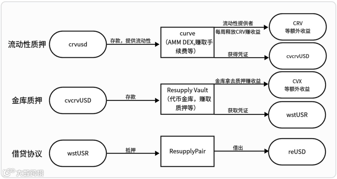 金库质押:cvcrvUSD被存入Resupply Vault,再换出wstUSR,Vault则拿这些资产去做策略投资,期望升值。