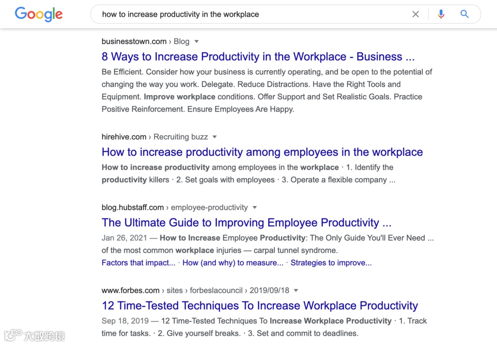 例如,“如何提高工作场所的生产力”的搜索结果排名靠前,其中包含一个特定的目标关键词。