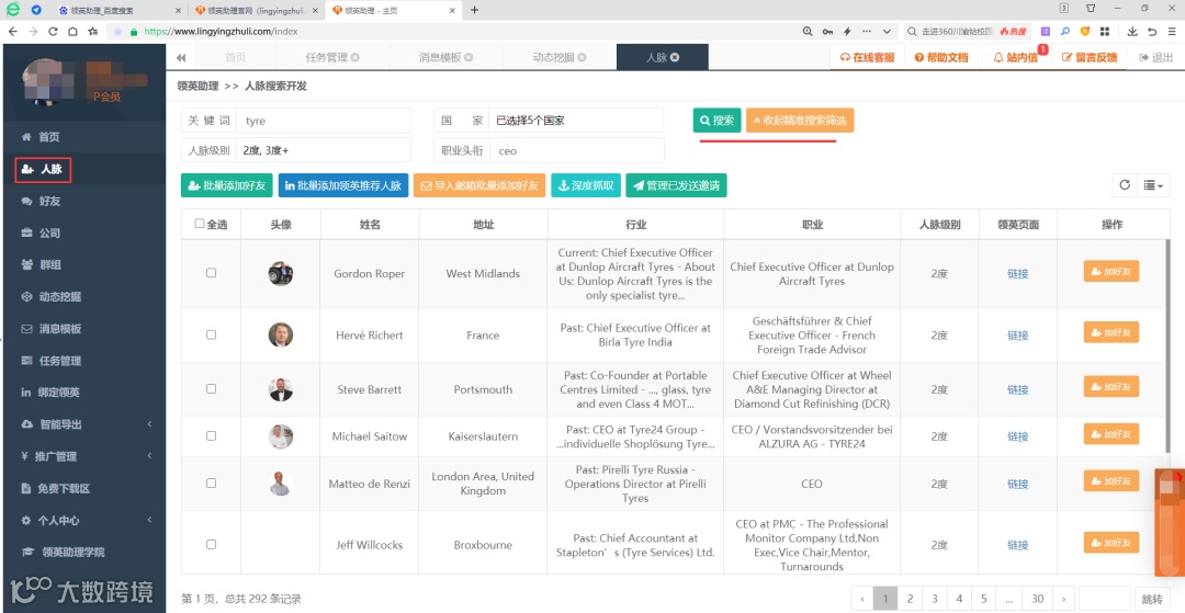 例如:输入关键词“tyre”,职位设为“CEO”;或关键词“深圳”,职位设为“外贸经理”,即可快速锁定符合条件的目标人群。