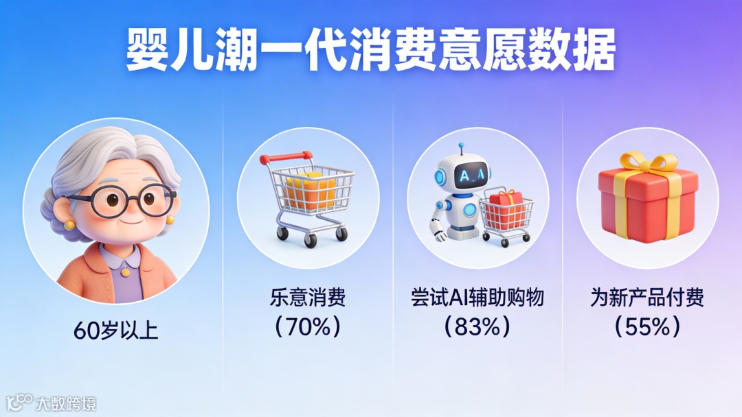 婴儿潮一代(60岁以上) 70%乐意消费,83%愿用AI辅助购物,55%愿为新产品付费。重视健康与高端品质,偏好含营养元素或高端成分的产品,品牌选择注重信任与熟悉度。
