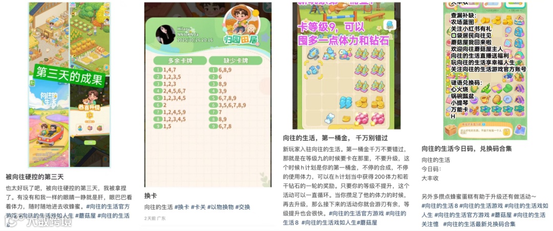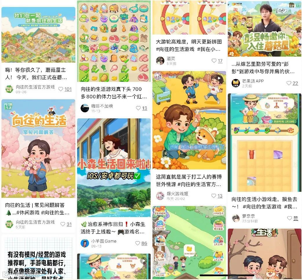 《向往的生活》小游戏的调性、节奏乃至画面风格,都刚好对应了这一人群的需求侧。小红书上自发出现的攻略、物品交换、体验分享,正说明了这部分用户的活跃度和传播力。