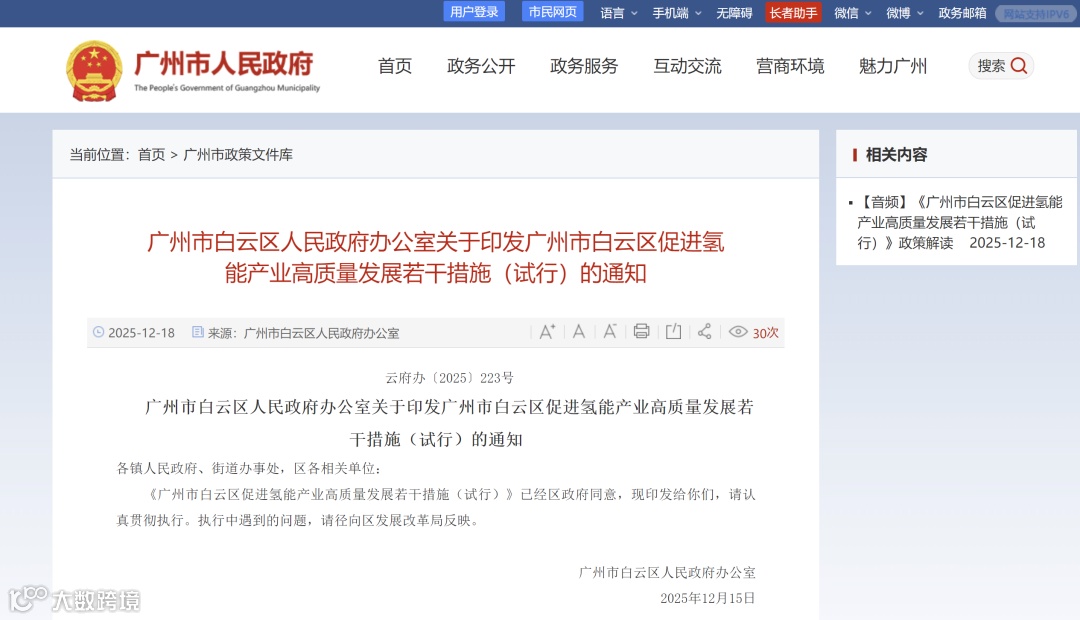 12月18日,广州市政府网站发布了《广州市白云区促进氢能产业高质量发展若干措施(试行)》(以下简称《措施》)。根据白云区政府的解读,这是白云区抢抓粤港澳大湾区氢能产业发展机遇、首次针对氢能产业制定的专项扶持文件。