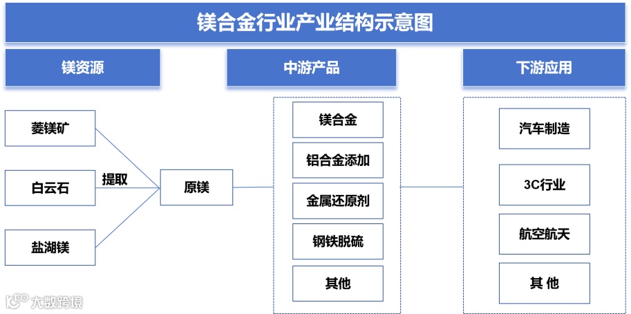 镁合金通过上游的矿石选矿、冶炼提纯、铸造塑性将原镁转化为镁合金,再经合金铸造、热处理和加工等环节,制成镁合金型材与铸件,广泛应用于汽车、电子、航空航天和医疗器械等领域。2024年中国镁合金产品下游应用消费占比分别为汽车工业70%(主要用于离合器壳体、阀盖、方向盘、动力总成、座椅支架等),3C电子产品20%(提升防震、散热和电磁屏蔽性能),航空航天领域约5%(结构件、舱门框架和发动机部件等),镁合金在机器人中的应用还处于起步阶段