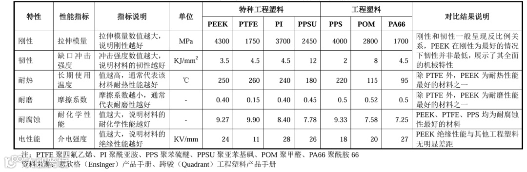 表:PEEK与主要工程塑料、特种工程塑料性能对比情况