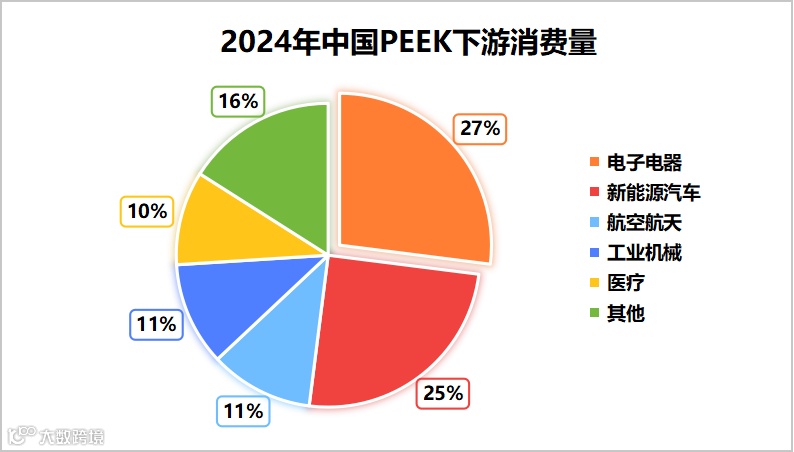 中国PEEK材料目前主要应用于电子电器绝缘器件、新能源汽车、航空航天的轻量化与耐高温部件、工业机械,以及氢能、半导体等多个新兴领域。其中,新能源汽车对“轻量化+耐高温”性能的迫切需求,推动PEEK在该领域的消费占比已提升至25%,成为第二大应用市场。