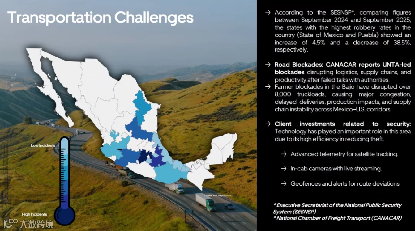 货物盗窃问题同样严峻。根据墨西哥国家公共安全系统(SESNSP)数据,2025 年 9 月墨西哥州(墨西哥城周边)的货物盗窃率同比上升 4.5%,尽管普埃布拉州等地区盗窃率下降 38.5%,但跨境运输的高价值货物(如汽车零部件、电子产品)仍是盗窃重点目标。