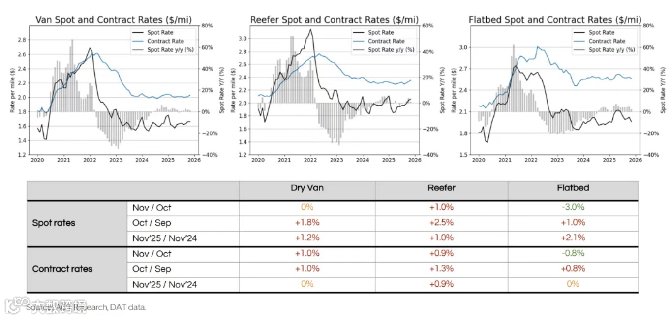 从当前费率表现看,不同运输类型呈现差异化复苏。根据 Uber Freight 援引 ACT Research 和 DAT 的数据,2025 年 11 月跨境线路中,干厢式货车(Dry Van)现货费率同比上涨 1.2%,冷藏车(Reefer)现货费率同比上涨 1.0%,而平板车(Flatbed)因季节性需求疲软,费率环比下降 3.0%,但同比仍保持 2.1% 的正增长。合同费率方面,冷藏车表现最优,11 月同比上涨 0.9%,厢式货车与平板车则与去年持平,显示市场从 “价格战” 向 “供需平衡” 过渡。