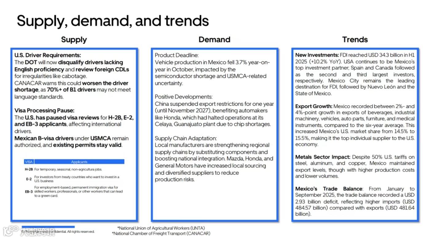 另一方面,美国交通部拟出台的 “非居民商业驾驶执照(CDL)限制政策”(目前正处于司法挑战中),若最终落地,预计未来两年将减少 19.4 万名跨境司机,而墨西哥全国货运商会(CANACAR)警告,70% 以上持 B1 签证的墨西哥司机可能因英语能力不达标被排除在外,进一步加剧运力紧张。