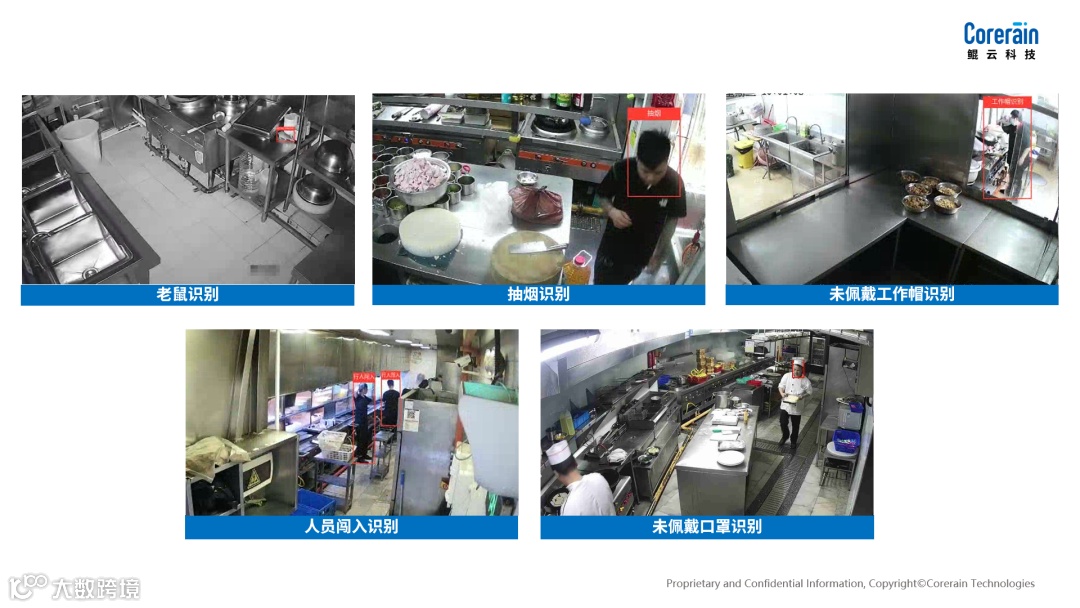 这次变革的核心还在于“大脑”的升级。系统引入了鲲云科技的 AI 视频分析技术,让监控设备拥有了“火眼金睛”。在实际运行中,AI 识别准确率已达到 95%以上,能够自动识别厨师未规范着装、鼠患迹象、垃圾桶未加盖、吸烟、玩手机等多种违规行为。