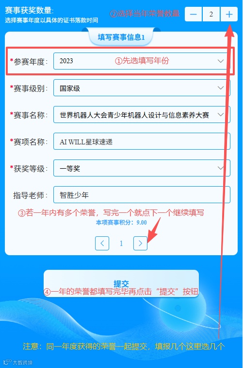 ④ 同一年获得的荣誉都填写完毕,再点击 "提交" 按钮