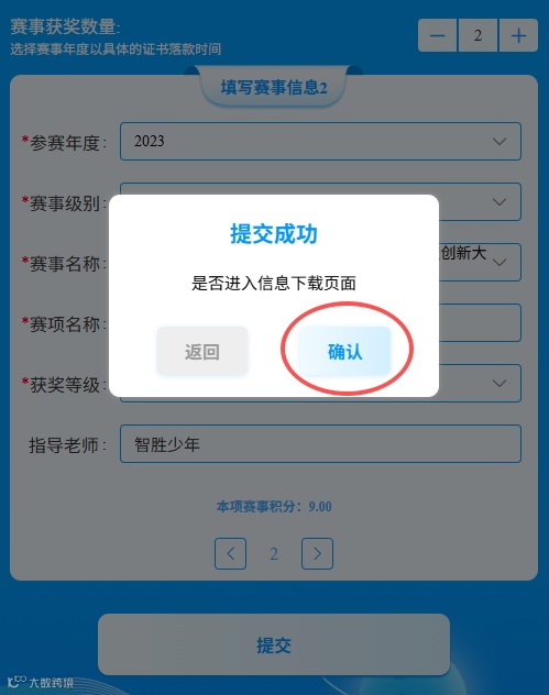 1.提交确认 - 完成所有赛事信息填写后点击 "提交" 按钮