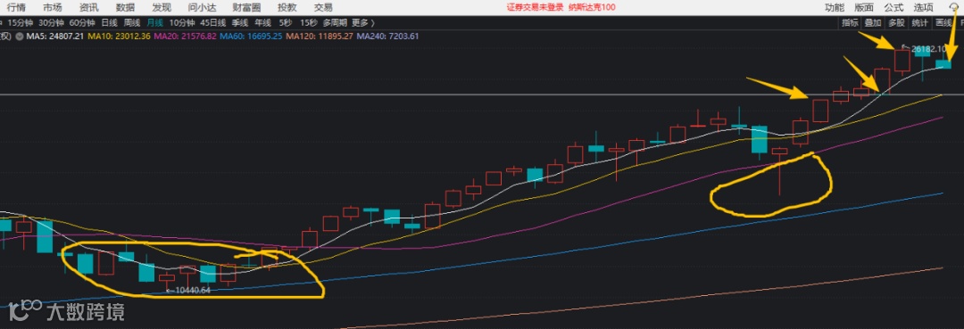 方法特别简单,就看乖离率 。打开纳指年线级别走势图,紧贴K线那根是5年均线(图上是白色的),远离5年均线就说明乖离率过大,后面会拉回修复,所以远离均线就没有投资性价比了,什么时候回到5年均线附近了我就开始弄他。