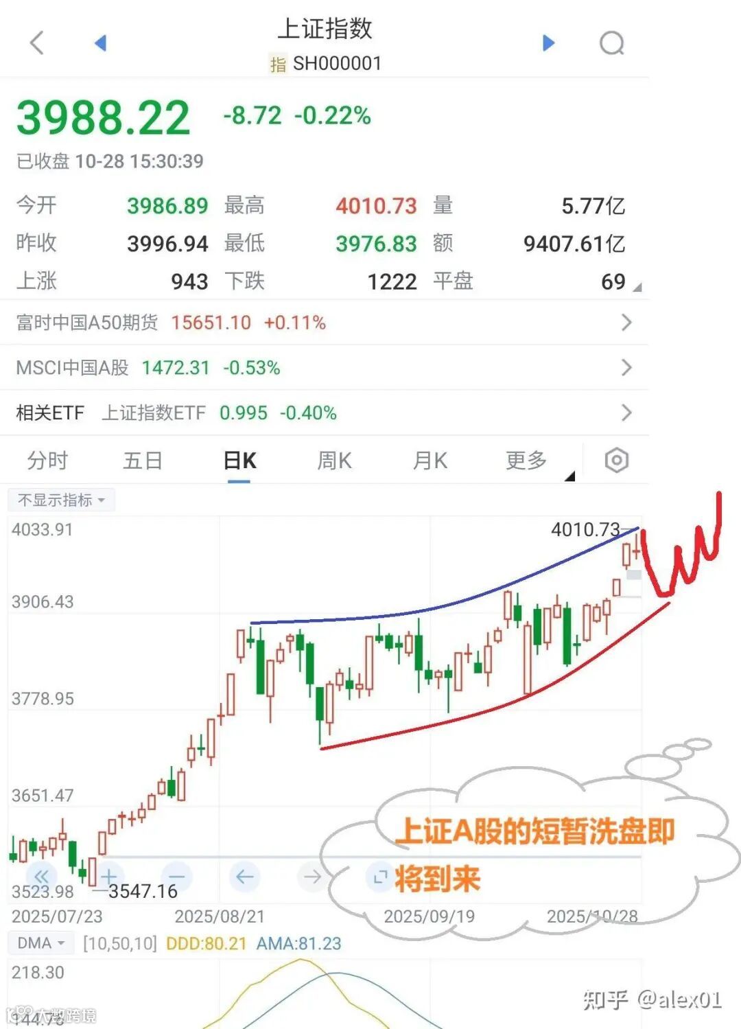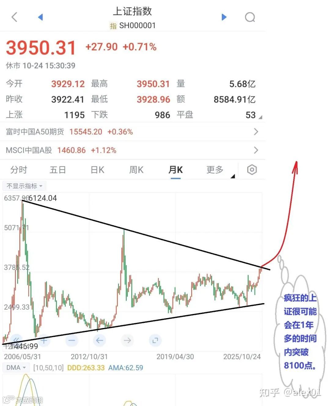 上证指数A股在2025十月28日继续向上突破4000后(几周前就预告了上证A股必破4000点,因为我预估上证A股会在1年多内大爆发,触及8100点),之后就会震荡调整走高。