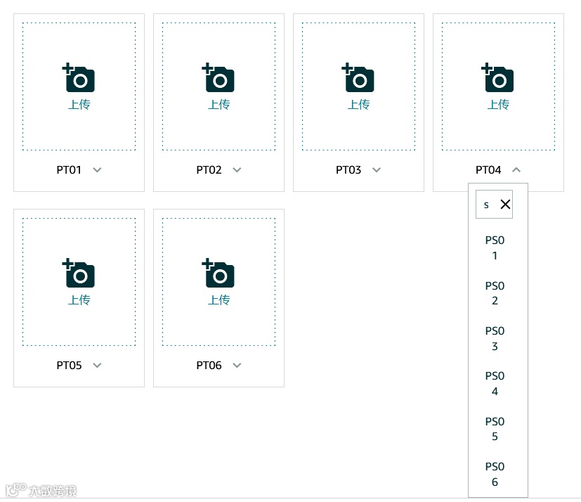 4. 从相机图标下方的下拉菜单中选择“商品安全性与合规性”相关代码 PS01、PS02、PS03、PS04、PS05、PS06,点击相机图标上传图片。