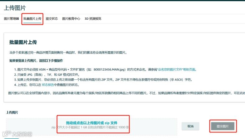 3. 在【上传图片】框中,通过拖动或点击的方式从电脑中添加图片或 zip 文件。如果通过点击的方式添加图片,请从电脑中选择一张图片,然后点击【打开】; 注意:您必须在上传前将图片命名为 ASIN.VARIANT(例如:B001234567.PS01)。附上文件后,卖家可以点击“提交图片”按钮。商品安全性与合规性”相关代码为PS01,PS02,PS03,PS04,PS05,PS06。此项操作不会覆盖您之前上传过的局部图片(PT01, PT02…)
