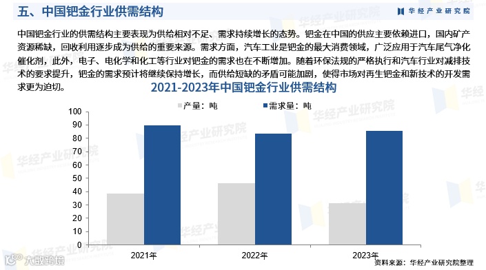 中国钯金市场呈现供给不足、需求持续增长的格局。国内矿产资源稀缺,供应高度依赖进口,再生回收正成为重要补充渠道。需求端以汽车尾气催化剂为主,电子、电化学和化工领域需求稳步上升。在环保政策加码和技术升级背景下,钯金需求有望持续扩大,供需矛盾或将加剧,推动对再生钯金及替代技术的研发投入。
