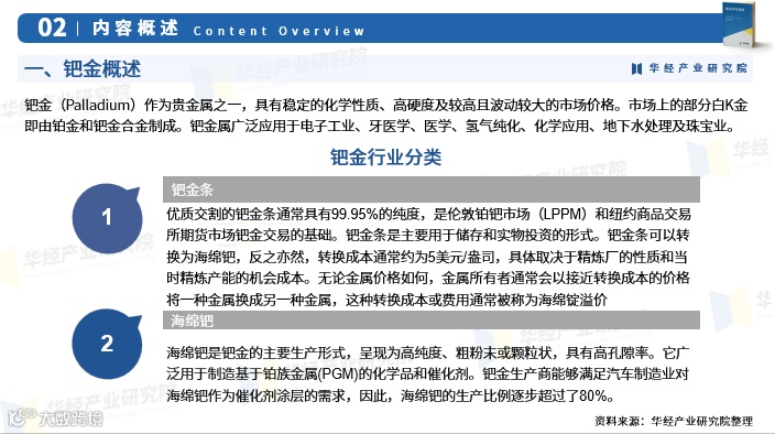 华经产业研究院发布《2025-2031年中国钯金行业市场竞争格局及发展趋势预测报告》,基于多年行业跟踪研究,采用桌面调研与定量、定性分析相结合的方法,全面解读钯金市场动态,深度挖掘潜在商机。报告科学运用研究模型,从多维度评估投资风险,为企业、科研机构及投资方提供决策支持。