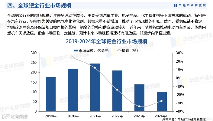 近年来,全球钯金市场规模呈波动增长态势,主要受汽车、电子、化工等下游产业驱动。其中,汽车尾气净化是核心需求来源。然而,供应链不稳、地缘政治冲突及环保法规趋严导致价格与供应波动加剧。随着电动汽车普及加速,传统燃油车需求放缓,钯金市场面临转型压力,未来增速预计将逐步趋稳。