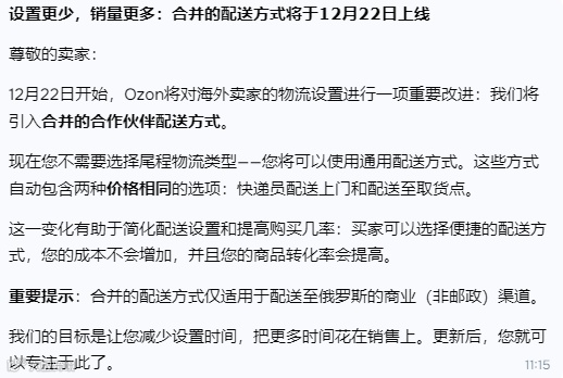 Ozon自12月22日起合并尾程配送方式:到点与到门统一为买家自主选择